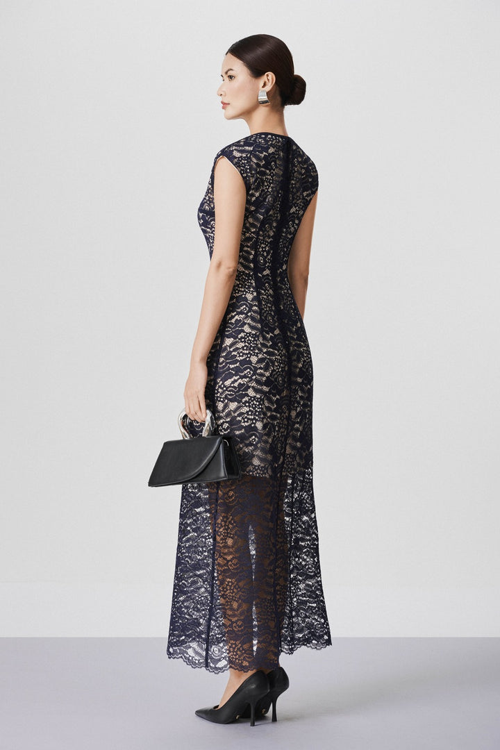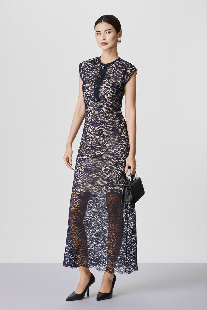 Expertly crafted with beautiful lace, this maxi dress features a two-layer design and elegant cap sleeves. Perfect for any occasion, the button row adds a touch of sophistication to this stunning dress. Look and feel your best with this must-have piece.