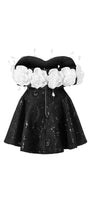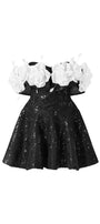 Two-color contrast, 3D roses cover off-shoulder neck, Corset waist design, Sequin mixed with lace in black one