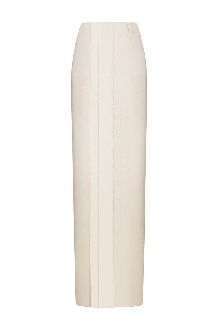 The skirt combines a sleek, straight silhouette with a front slit for subtle movement and ease. Crafted from smooth, lustrous sateen, it delivers both elegance and comfort. This expertly tailored maxi skirt is suited for refined occasions, offering a sophisticated foundation for versatile styling.