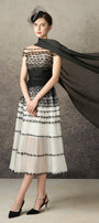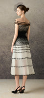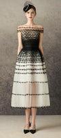 The midi dress showcases expert design with its two-tone mesh lace fabric and a sophisticated illusion neckline. A small bow detail around the bodice adds a subtle yet elegant accent, enhancing the dress’s flattering silhouette. This piece offers a perfect balance of modern style and timeless refinement.
