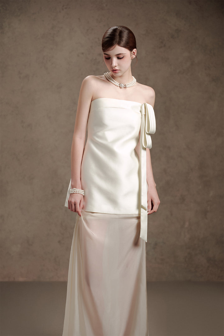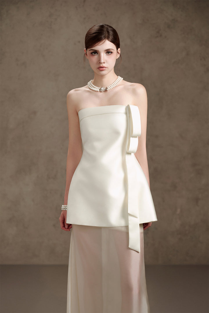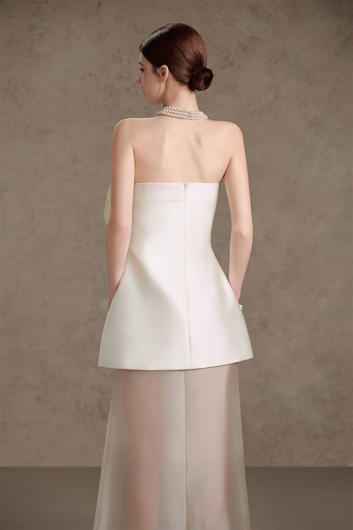 The top features a sleek, straight-across neckline that highlights the collarbone with understated elegance. Crafted from lustrous taffeta, the peplum silhouette enhances the waistline, creating a balanced and polished profile. This top is ideal for elevating both professional and evening ensembles with its refined structure and sophisticated detailing.