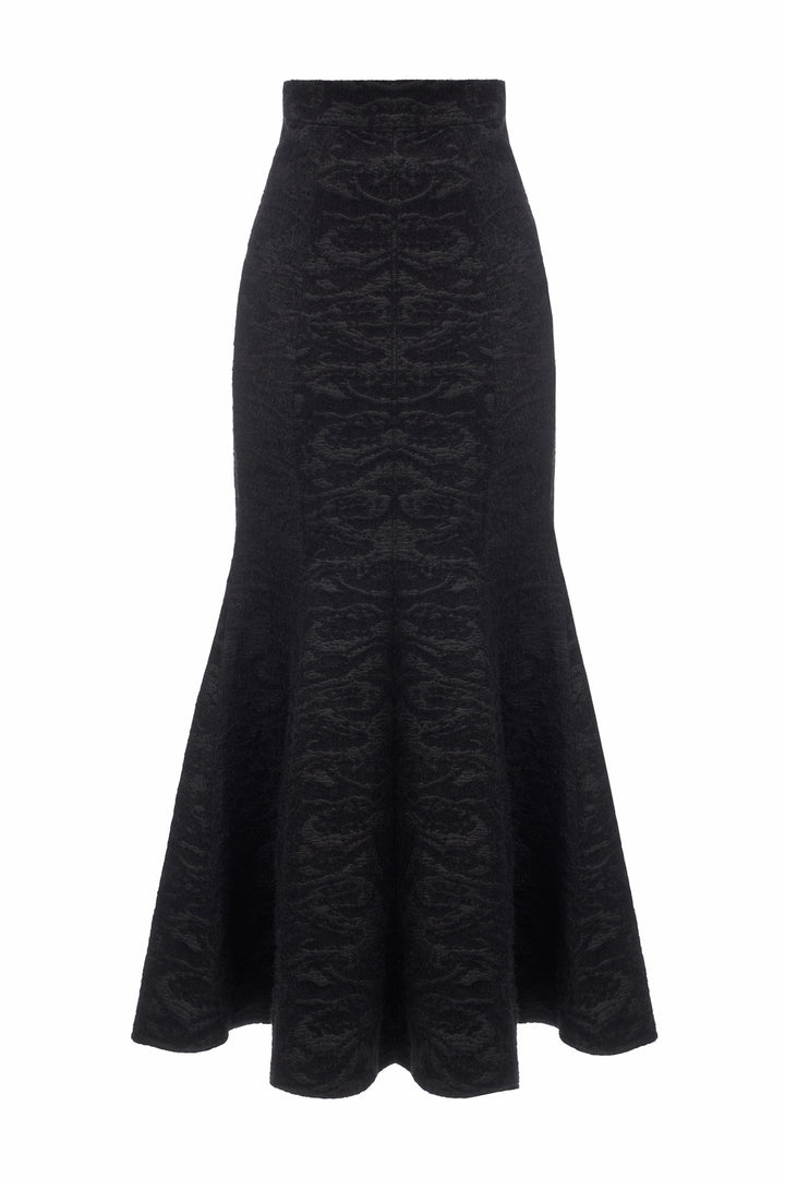 The skirt combines classic tailoring with modern elegance. Crafted from textured tweed, its high waist silhouette enhances the figure, while the mermaid cut gracefully flares below the hips. A side slit adds subtle movement and ease, making it ideal for both professional settings and refined occasions. This skirt offers a sophisticated balance of structure and fluidity, perfect for those seeking polished style with a contemporary edge.