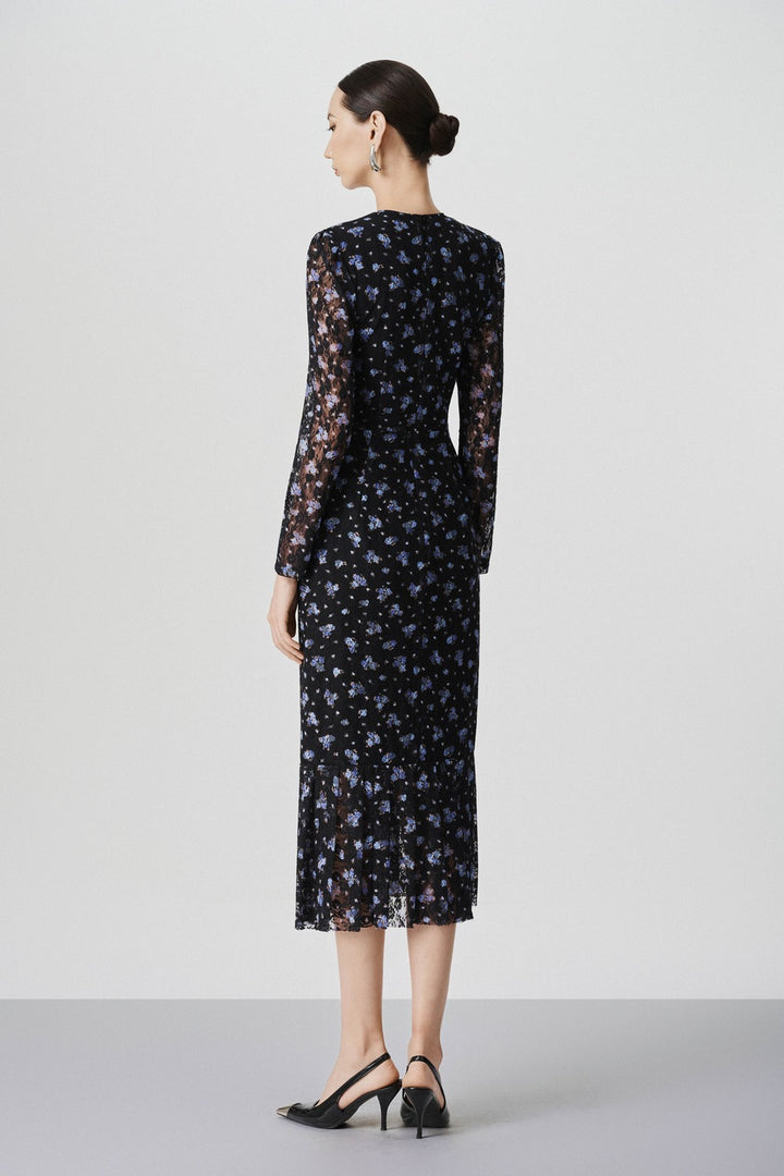 This elegant dress features a classic drop waist design and a mix of intricate lace patterns. The pleated lower skirt adds a touch of charm, while the white bow row and crease on the front offer a timeless appeal. Perfect for any occasion, this dress exudes sophistication and style.