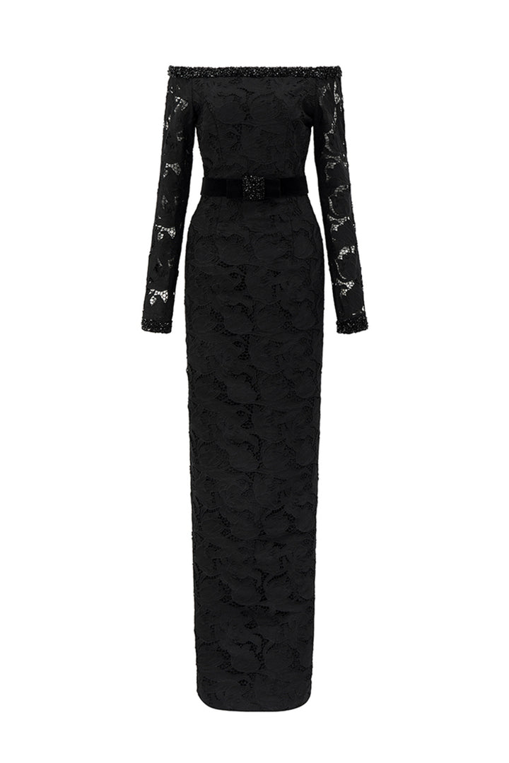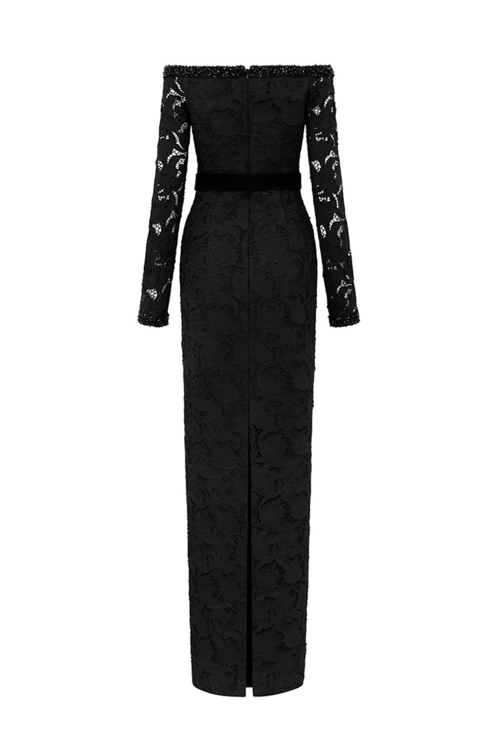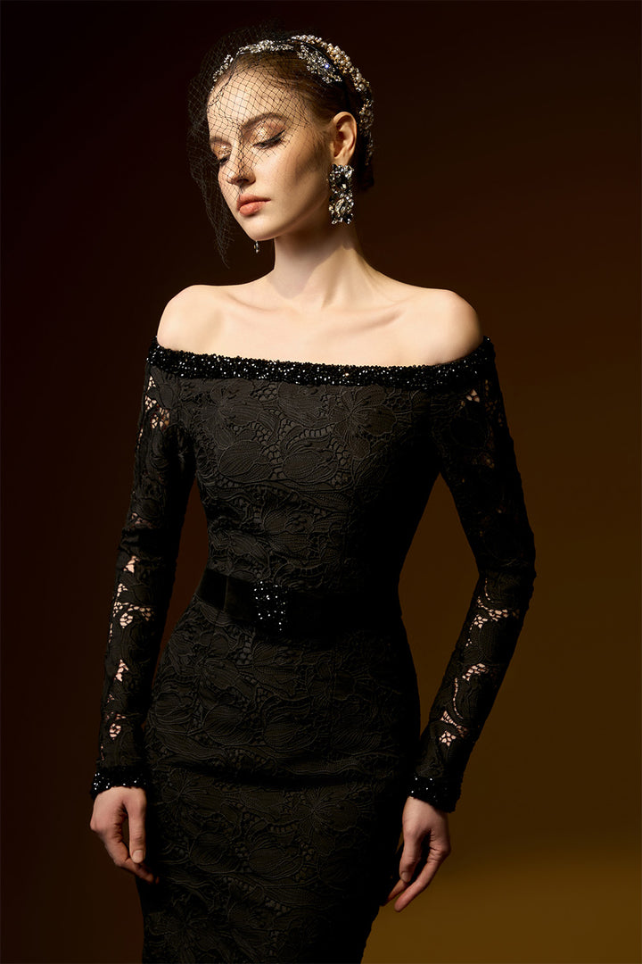 The dress is perfect for any special occasion. Its figure-flattering sheath silhouette and elegant off-shoulder design will make you feel confident and chic. Made with high-quality lace, this dress exudes luxury and sophistication. Elevate your style with Zelda.