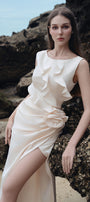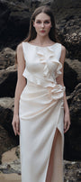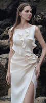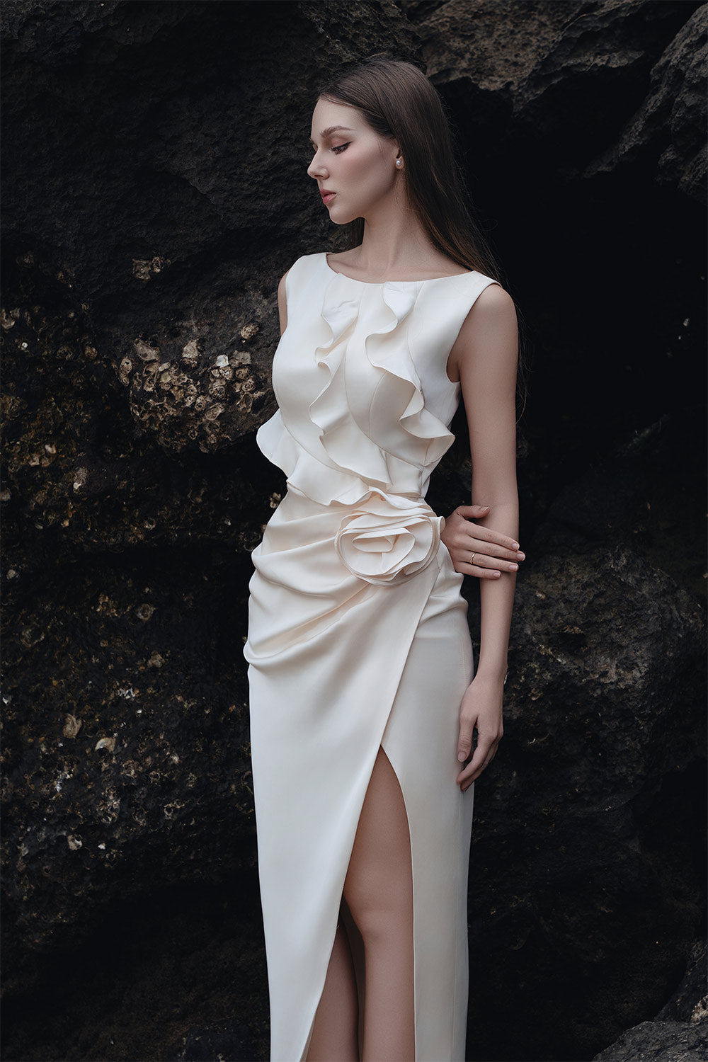 Special Features: Side draped with floral, Ruffle detail on the top, Side slit