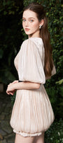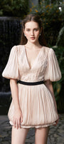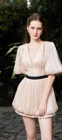 Elevate your wardrobe with this expert-crafted bubble mini dress, featuring a flattering V-neck, pleated detailing, and stylish puff sleeves. Perfect for weddings, cocktail parties, or any sophisticated event.