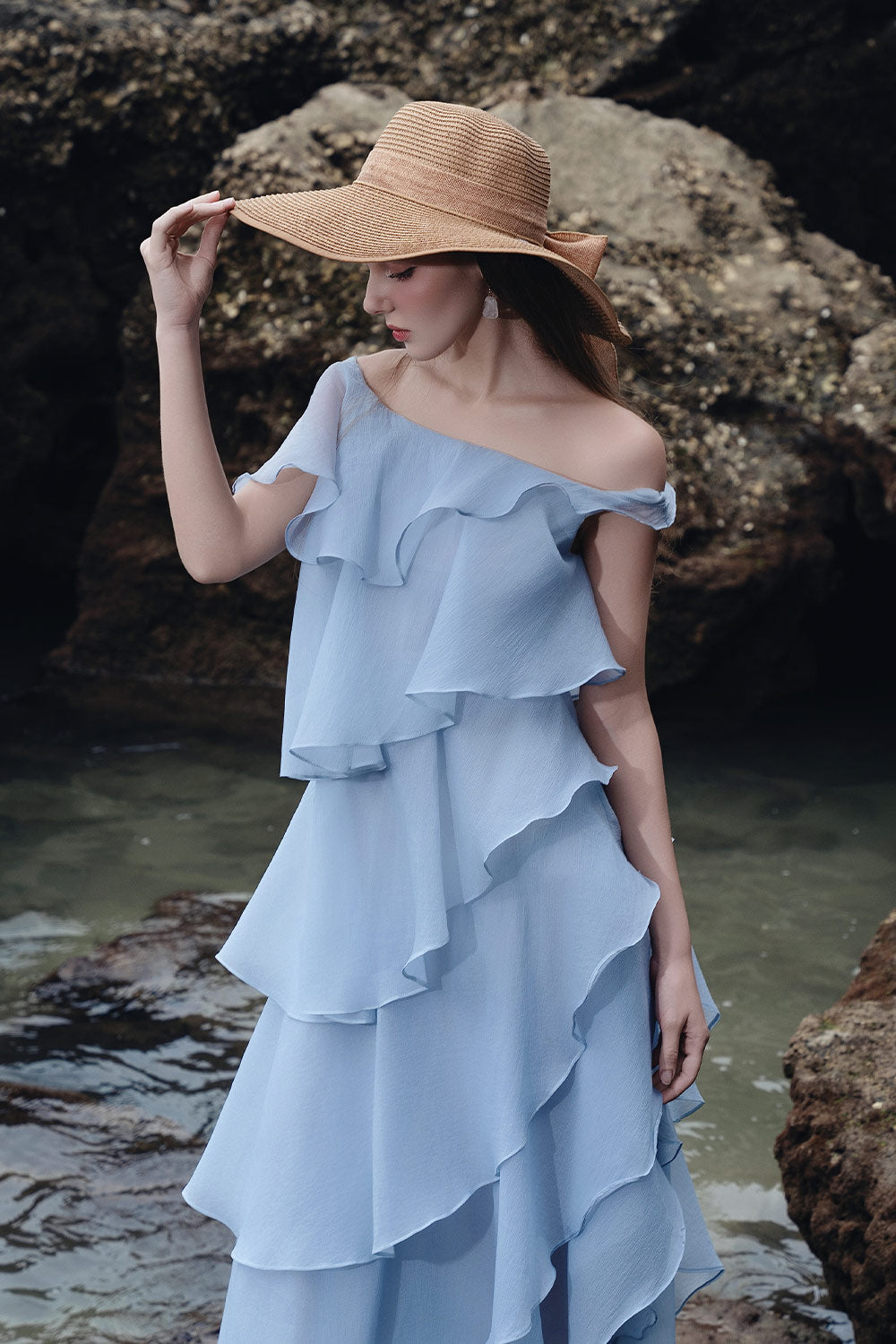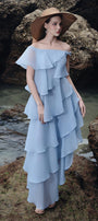 Expertly crafted with a layered off-shoulder design, the dress exudes effortless elegance. With delicate organza fabric, it provides a lightweight and airy feel, perfect for any formal occasion. Its off-shoulder style adds a touch of femininity, making it a must-have in any fashion-forward wardrobe.