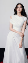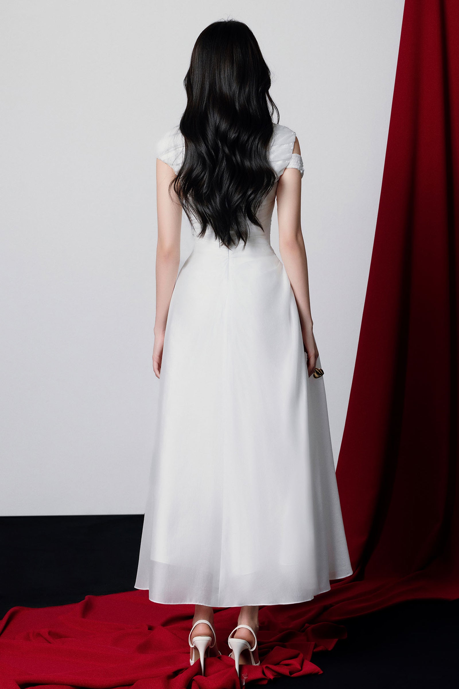 Elevate your wardrobe with this expert-crafted A-line midi dress, featuring an asymmetric neckline and sleeve, graceful draped silk, and a modern silhouette. Perfect for cocktail events, sophisticated gatherings, or formal evenings.