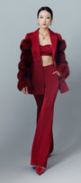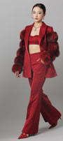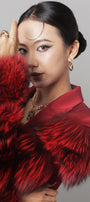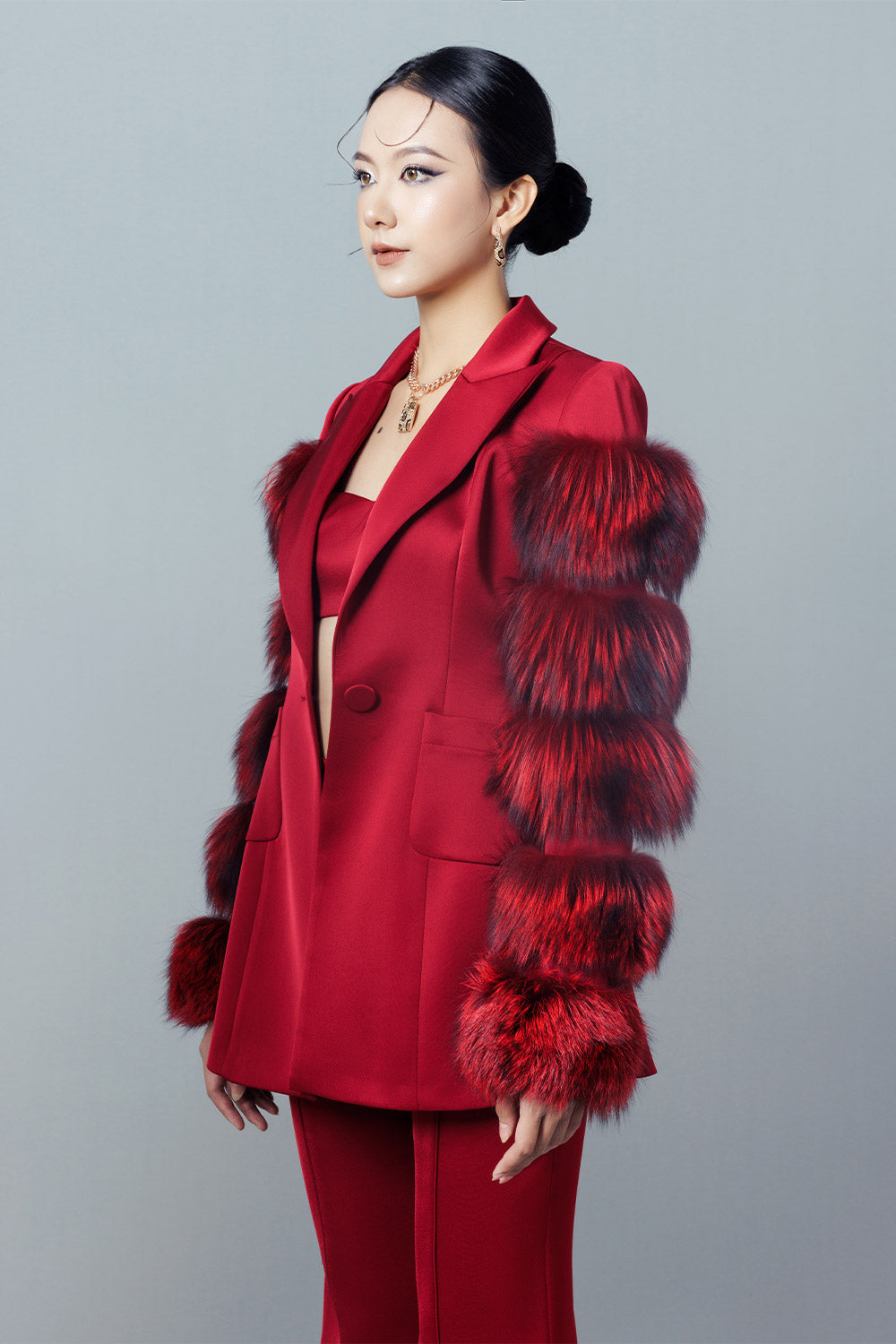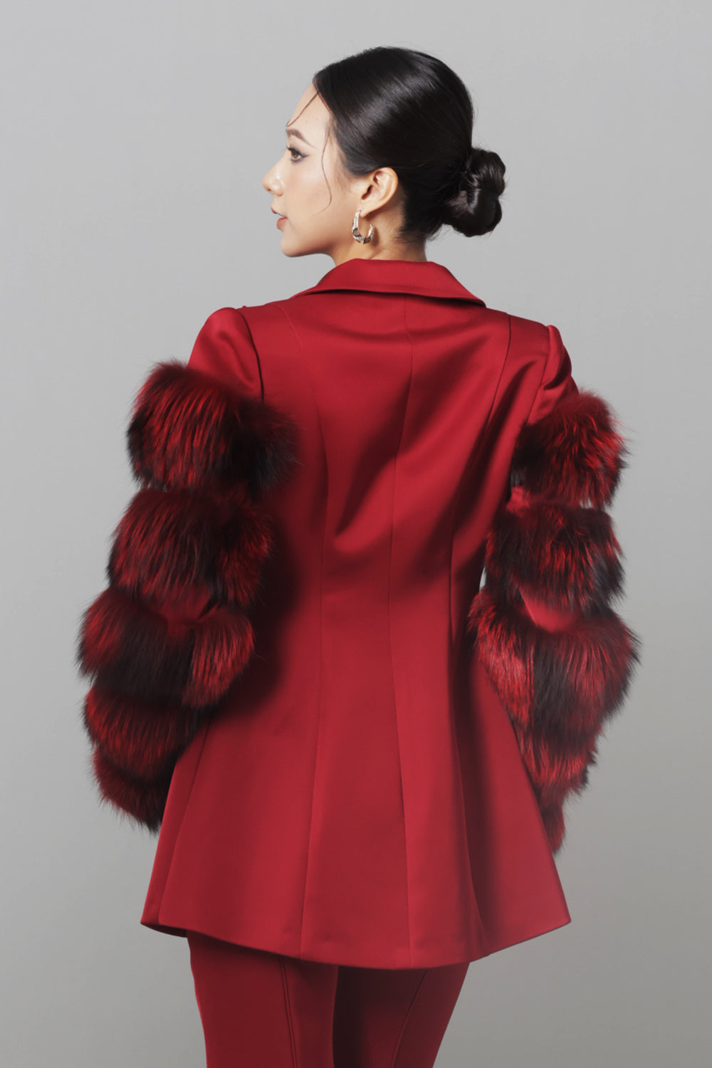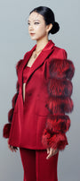 Tiered fur attached along the sleeves, Fisheye dart, One button covered matching fabric