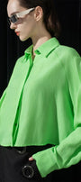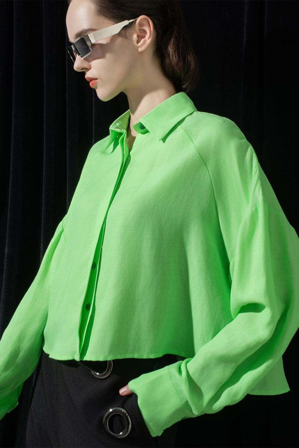 V-neckline with collared lapels, Hidded button brace, Sheer effect, Slit cuff with button