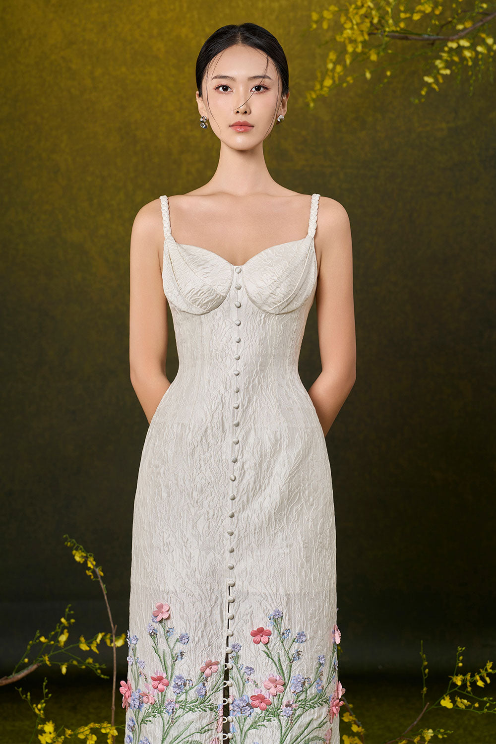 Botanical floral and butterflies embroidery , Draped chest cup with braided straps, Prominent patterns on fabric, Faux covered button line, Front slit with knot and button closure