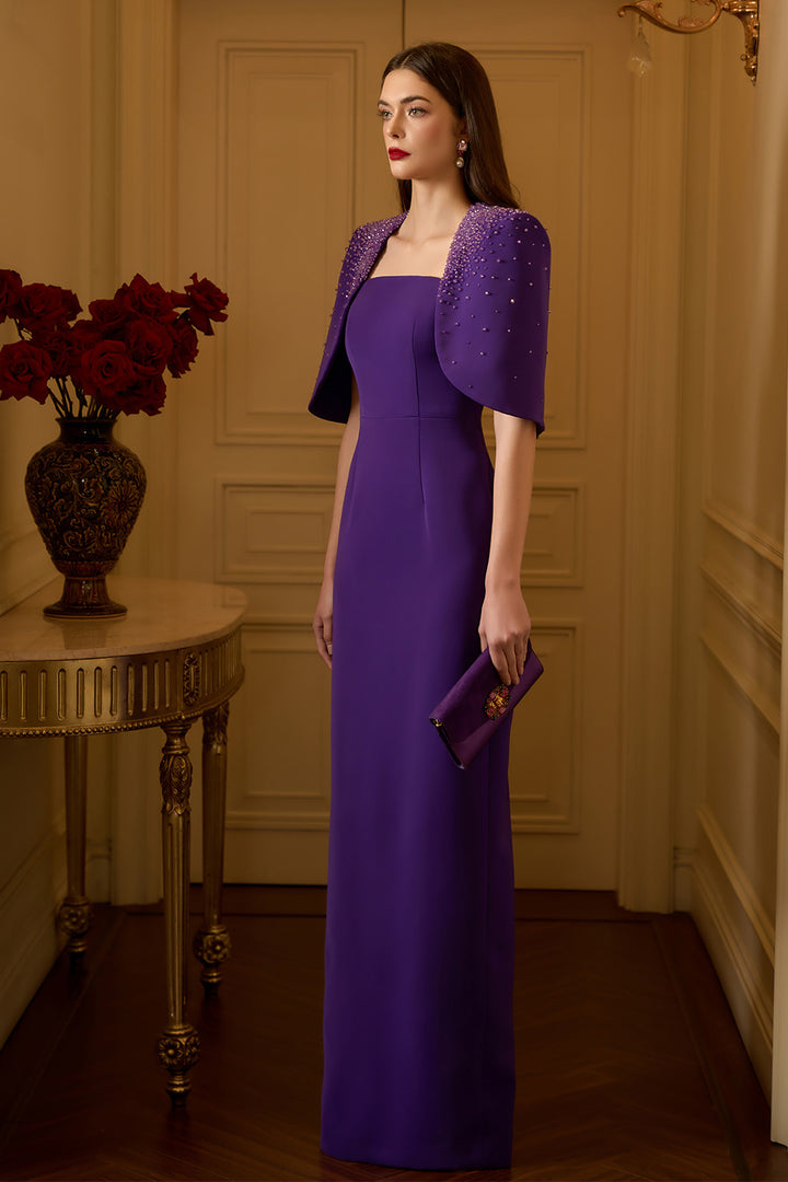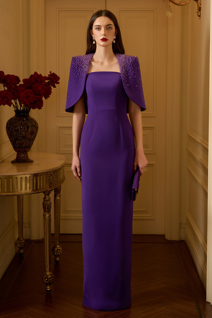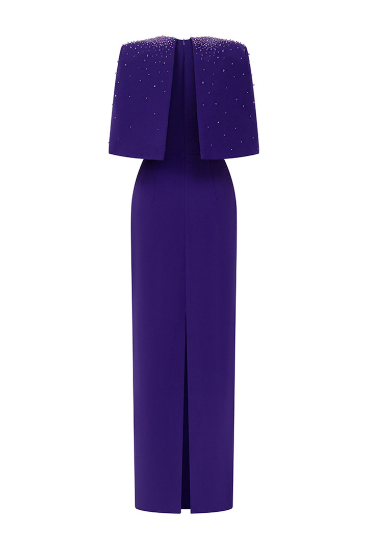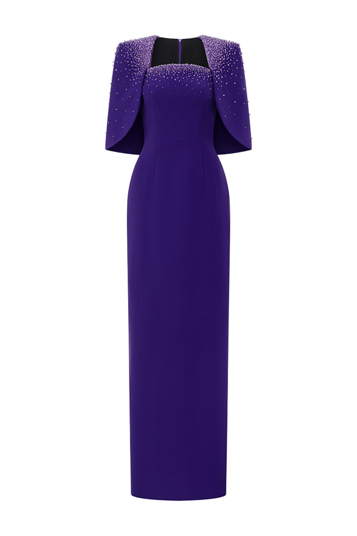 Elegant and sophisticated, the dress features a unique cape shoulder design and a figure-flattering sheath silhouette. Crafted from high-quality crepe, this dress is perfect for special occasions and will make you stand out in any crowd.