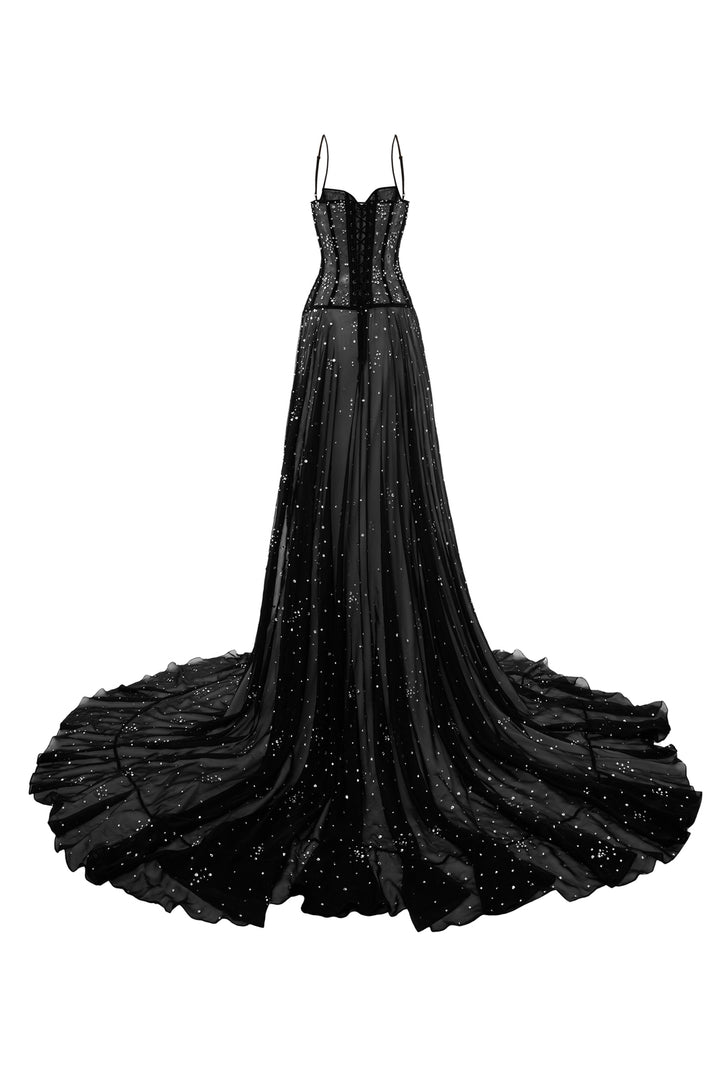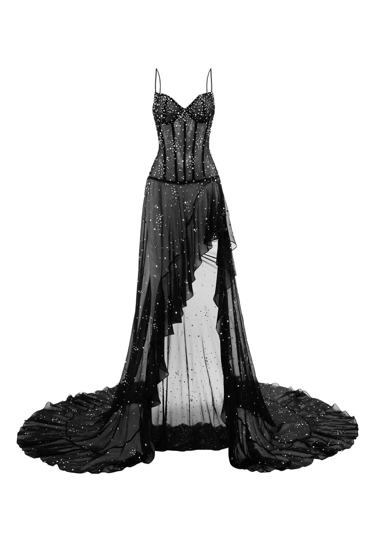 This dress features a corset waist that enhances your silhouette with structured support. Delicate spaghetti straps add a refined touch, while the high-low chiffon skirt creates graceful movement and visual interest. The sheer fabric offers a subtle, elegant allure, making it perfect for sophisticated occasions where style and comfort meet seamlessly.