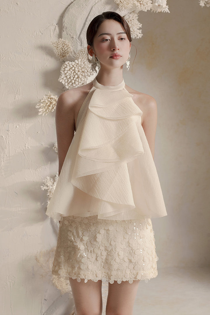This top features a sophisticated halter-style neckline secured with two elegant pearl buttons at the back. Its slightly A-line silhouette offers a relaxed fit, while the tiered layered front bodice adds dimension and refined texture. Crafted from crinkle organza, this top combines delicate structure with effortless style, making it a versatile piece for elevated, expert dressing.
