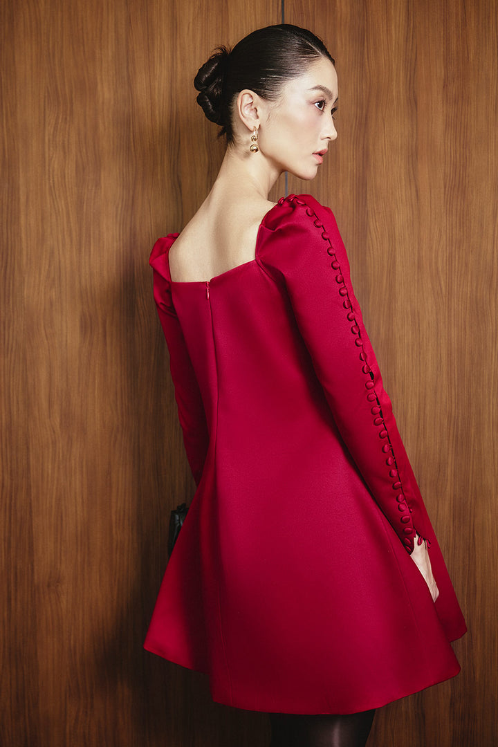 Dynamic short babydoll dress destroys all pen lines. The combination of arched neck and long sleeves combined with many sophisticated pleated buttons helps her to be confident, comfortable, and elegant.