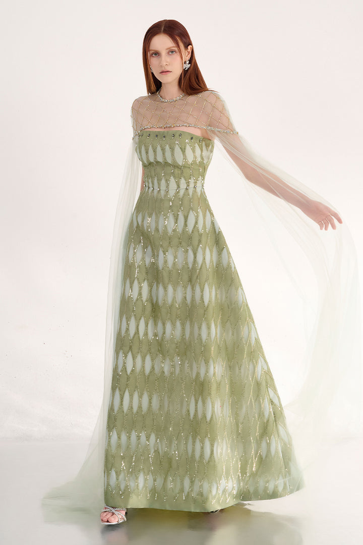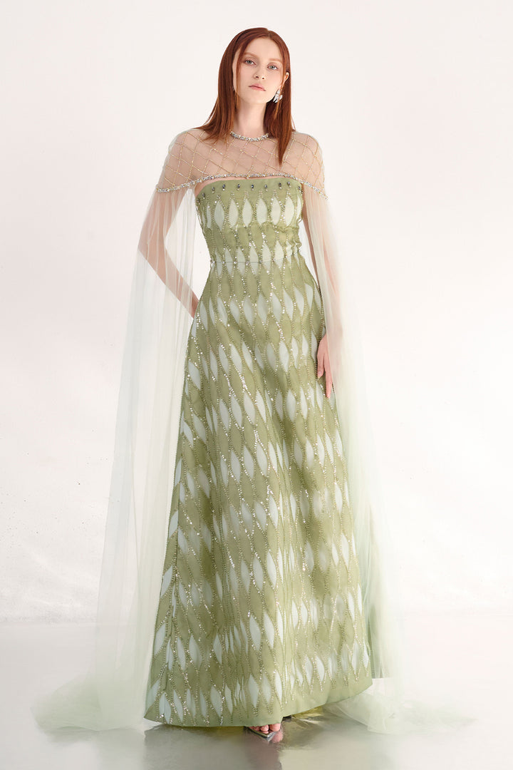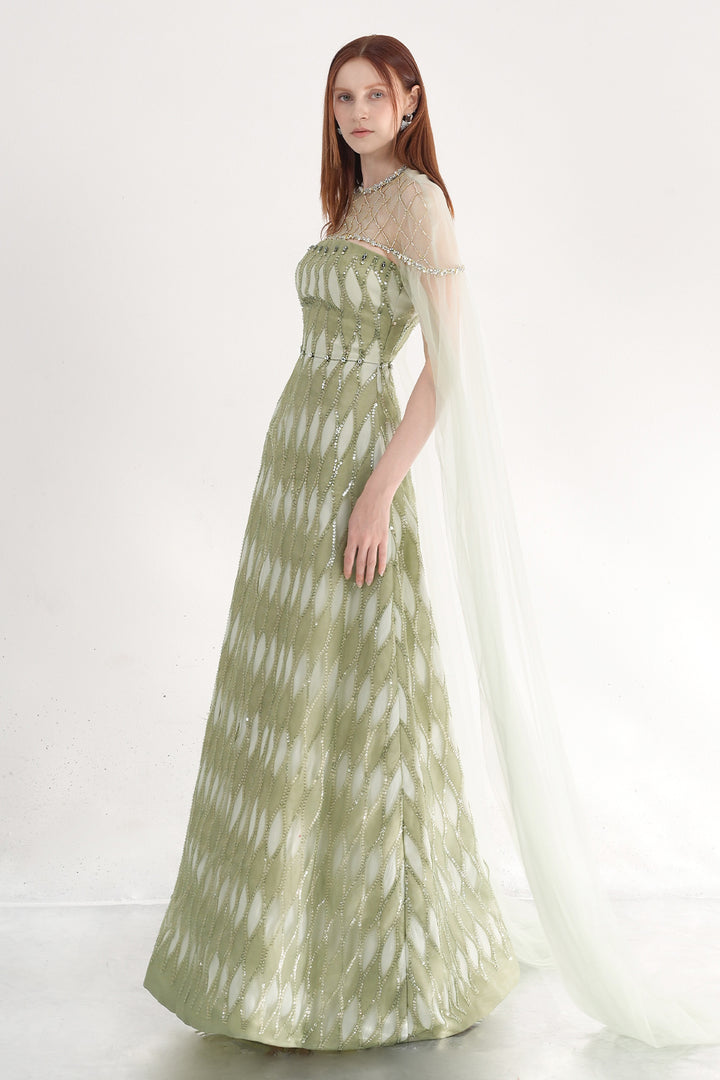The dress features a refined A-line silhouette complemented by elegant cape-style shoulders. Crafted from high-quality polyester, this dress offers a graceful flow and sophisticated coverage, perfect for formal occasions. The cape shoulder detail adds a dramatic yet polished touch, enhancing the overall silhouette with expert tailoring that ensures both style and comfort. This dress is an excellent choice for those seeking timeless elegance with a contemporary edge.