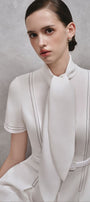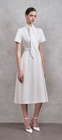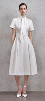 Introducing the dress with its elegant and modern design, this midi dress is the perfect addition to your wardrobe. The tie neck adds a touch of sophistication, making it suitable for any occasion. Made with high-quality cotton, it is both comfortable and refined. Upgrade your style with this polite and chic dress.