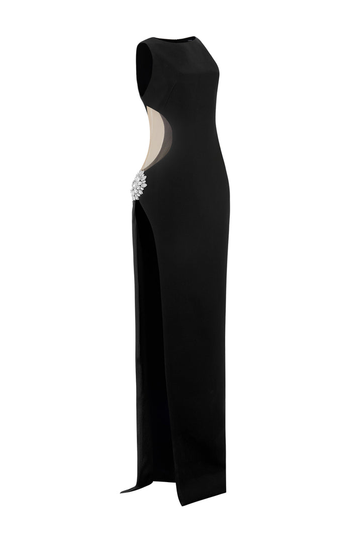 Elevate your evening wardrobe with the dress. Crafted from smooth crepe fabric, this dress features a daring high slit and a strategically placed cut-out at the waist, accentuating your silhouette with sophisticated allure. Perfect for formal events or upscale gatherings, it combines modern design with expert tailoring to ensure a flattering fit and confident presence.