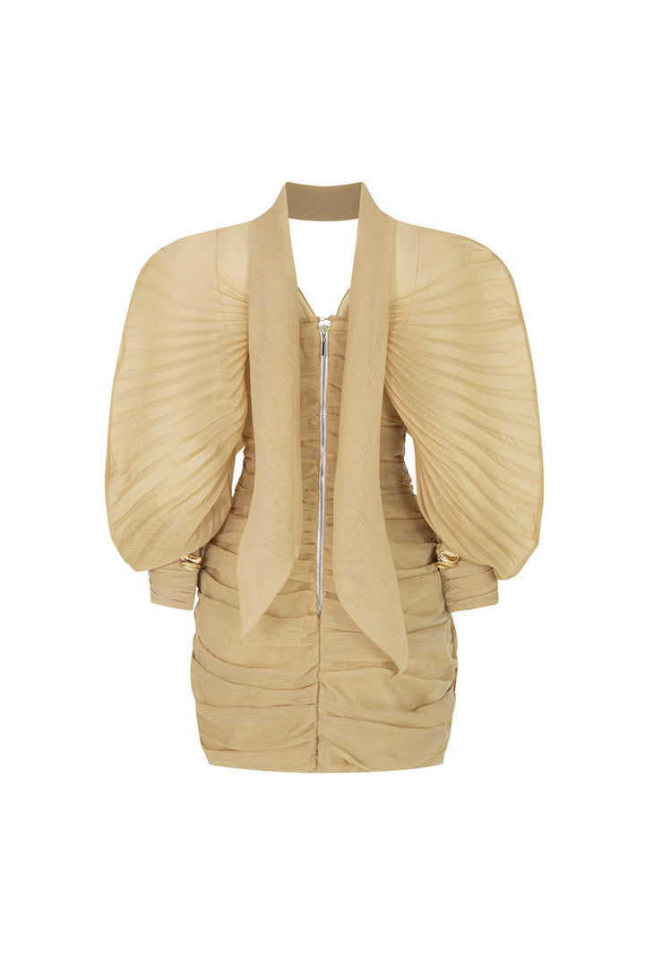 The mini dress features elegant batwing pleated sleeves that add a dramatic flair, perfectly balanced by a gathered bodice that enhances the silhouette. Crafted for a flattering fit, this dress combines structured detailing with soft muslin fabric, making it an ideal choice for sophisticated occasions where style and comfort are paramount.