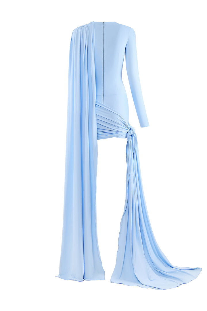 The mini dress features a sleek, form-fitting silhouette crafted from stretchy spandex for comfortable wear and a flattering fit. Its standout design includes an extended flap detail that adds a modern, architectural edge to the classic mini dress shape. The round neckline offers a balanced, elegant frame that complements the bodycon style, making it suitable for both day and evening occasions. This dress combines contemporary design with versatile comfort, ideal for those seeking a bold yet refined look.