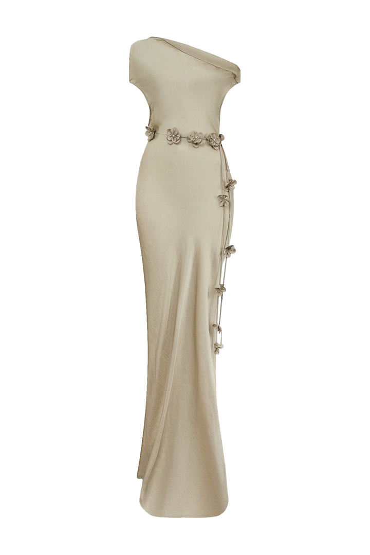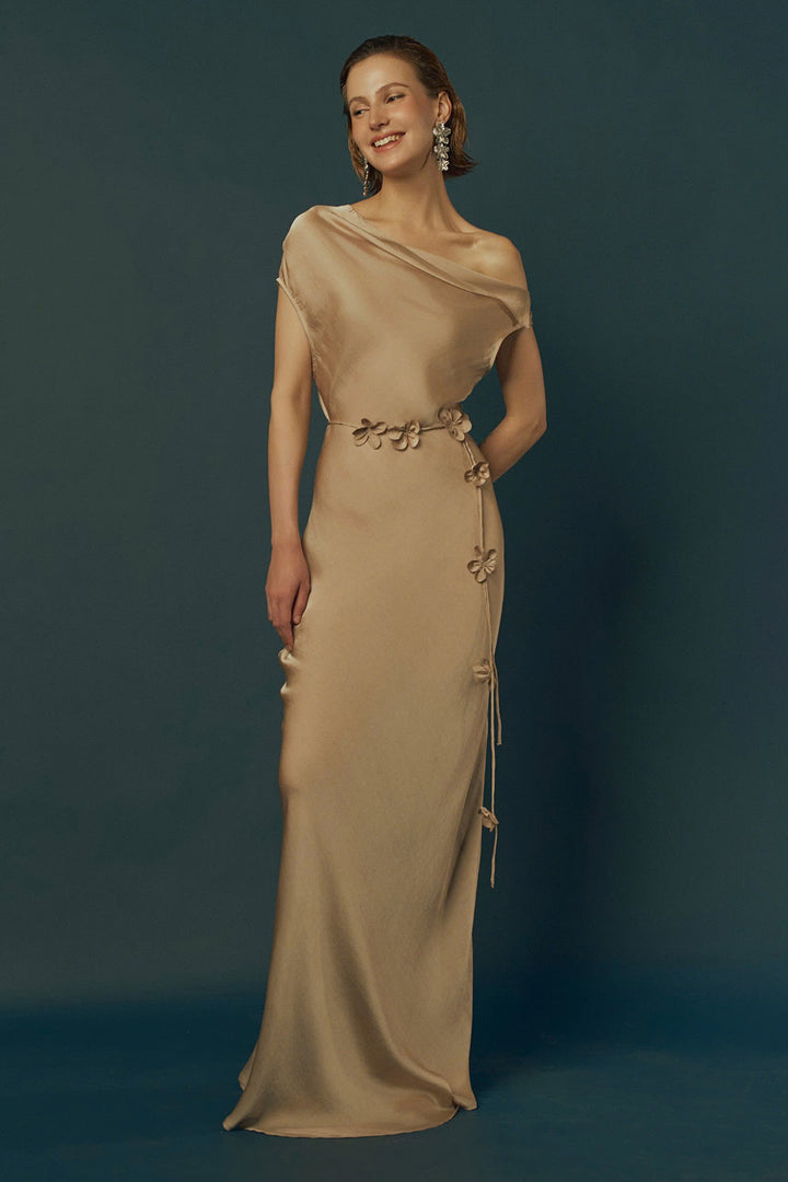 This floor-length dress features a refined sheath silhouette crafted from luxurious poly silk, designed to drape beautifully. Its standout asymmetric neckline adds a modern edge while flattering the shoulders with subtle sophistication. Ideal for formal occasions, the dress combines timeless elegance and contemporary design to ensure a confident, polished look.