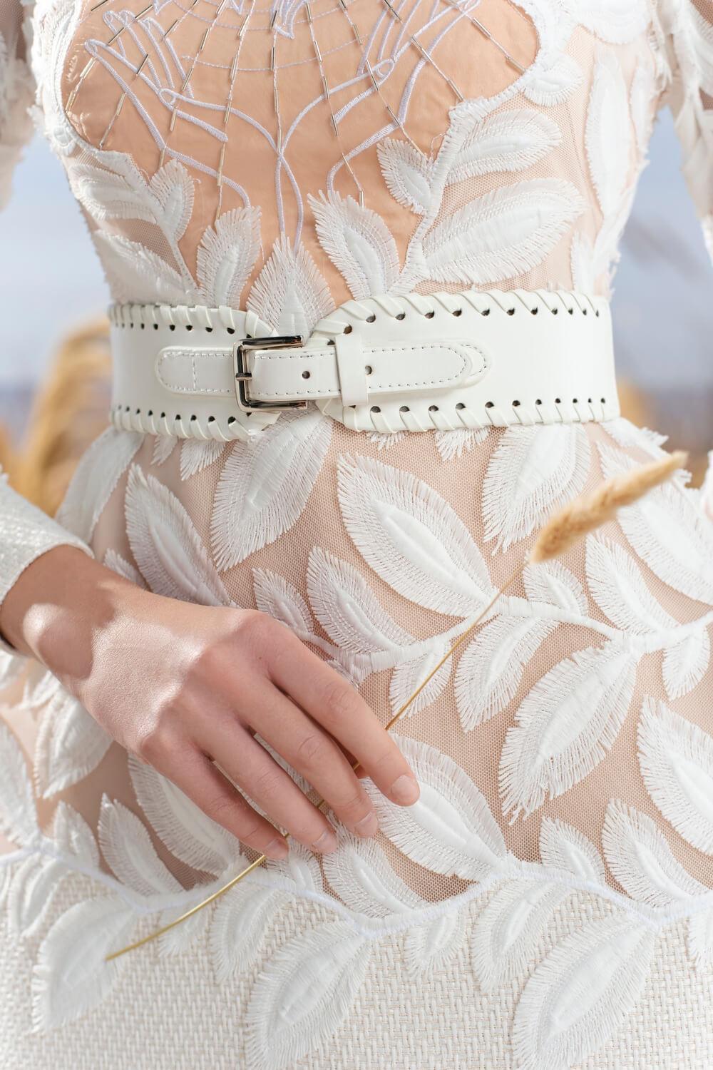 Inspired by the image of the sun with the meaning of shining and full of life, it brings positive energy to the ladies to shine. Another notable highlight is the extremely special lace material that forms each white leaf embroidered with embossed fringes to create sophistication, femininity, and elegance for the wearer.
