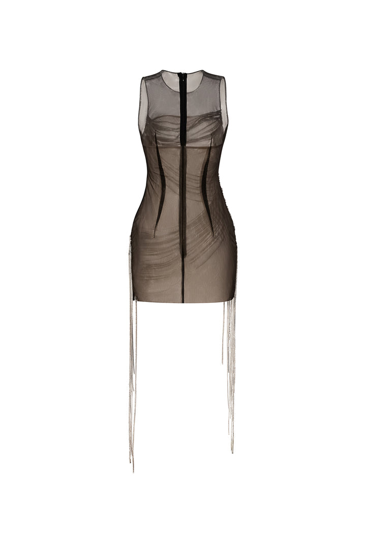 This mini dress features a flattering round neck and a sleek chiffon fabric that contours the body for a sophisticated silhouette. The front is adorned with delicate stone embellishments, adding a subtle sparkle that elevates the dress for evening occasions or special events. Its bodycon fit ensures a confident, polished look while the lightweight chiffon offers comfort and ease of movement. Ideal for those seeking a refined yet eye-catching piece.