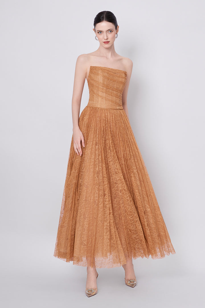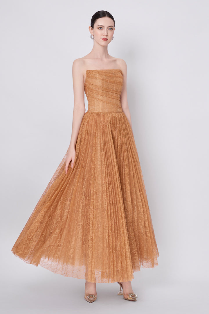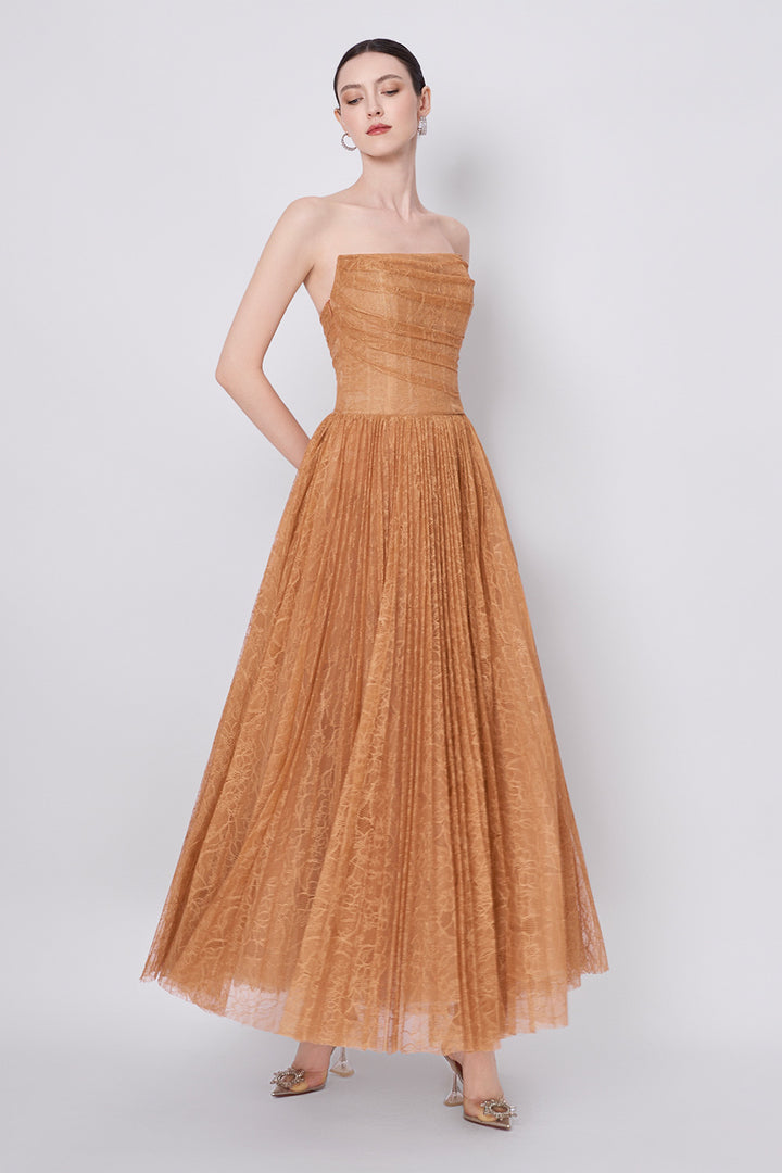 Discover elegance and sophistication with our dress. Our strapless design and intricate pleating create a timeless look, perfect for any formal occasion. Crafted with high-quality tulle fabric, this dress is both comfortable and stylish. Elevate your wardrobe with this must-have dress.