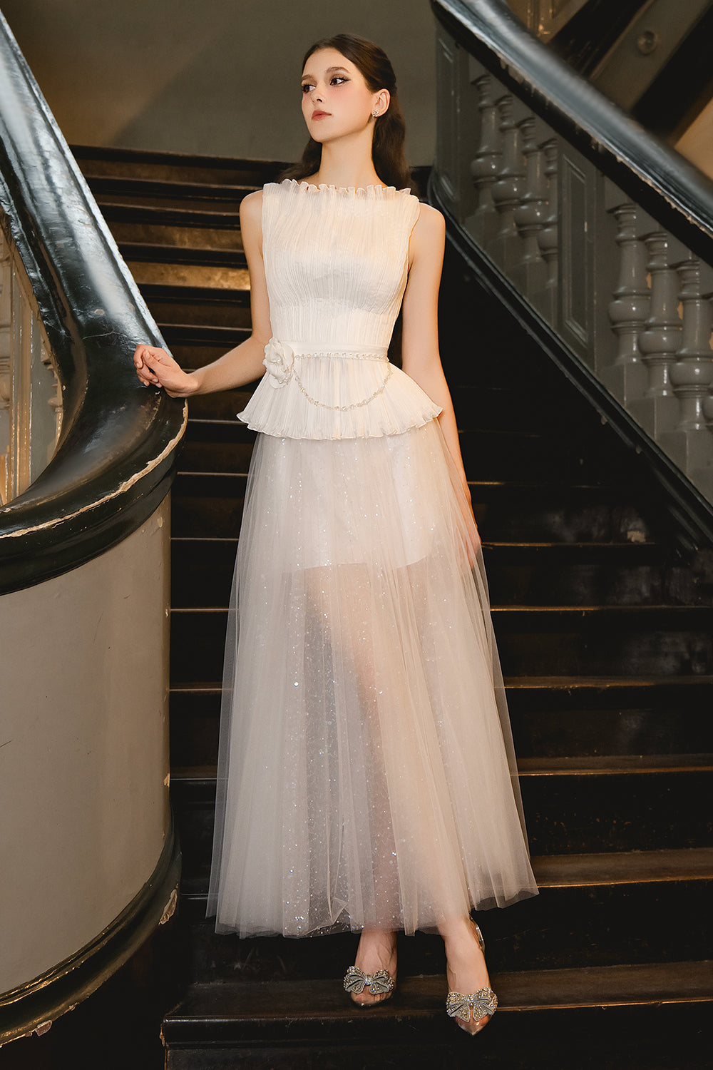 This sleeveless top commands attention with its daring silhouette. Featuring a delicate bead and flower belt, it adds intricate, feminine detail that elevates your look. The ruffle trim hem creates playful movement, bringing an edgy yet elegant flair to any outfit. Perfect for those who want to stand out with subtle sophistication.