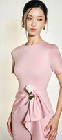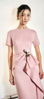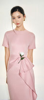 Special Features: Draped fabric at the waist creating a flowing, A white flower at the gathering point