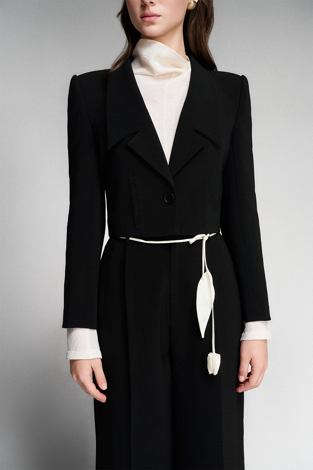 This stylish jacket features a cropped notch lapel design for a sleek and modern look. Crafted with precision, this jacket offers comfort and sophistication. Elevate your wardrobe with this must-have piece.