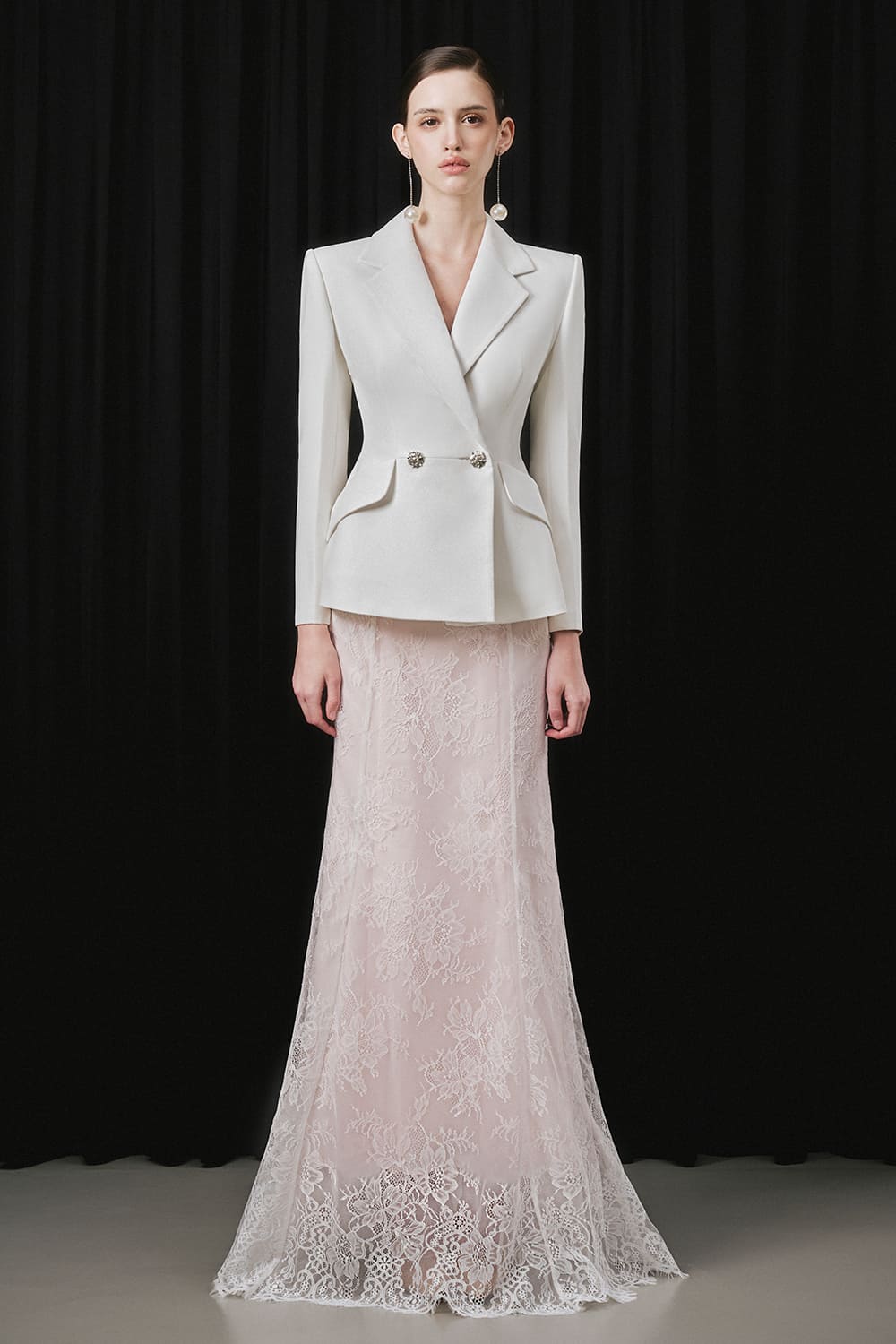 Double-breasted bead button, V-neck with notch lapel, Flap pocket at the peplum hip, Square shoulder
