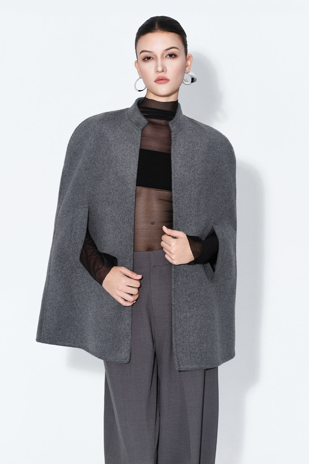 Expertly tailored from premium wool, this trapezoid cape features a sophisticated high neck and elegant cape sleeves for a timeless silhouette. Ideal for formal gatherings, stylish events, and upscale evenings.