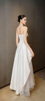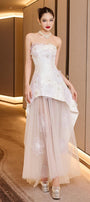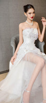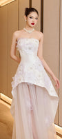 Special Features: Handcrafted 3D floral embroidery, Two-layers bottom with different fabric, Corset lacing at the back, Sheer mesh skirt at the front