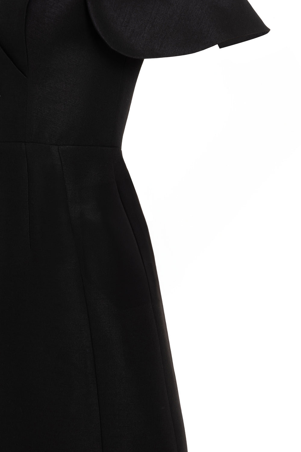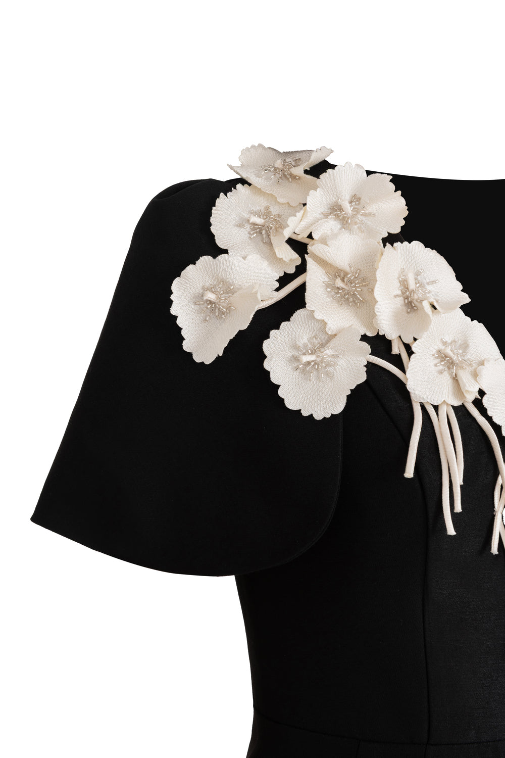 Slit cape sleeves, Flower applique attached on the chest, Dart lines
