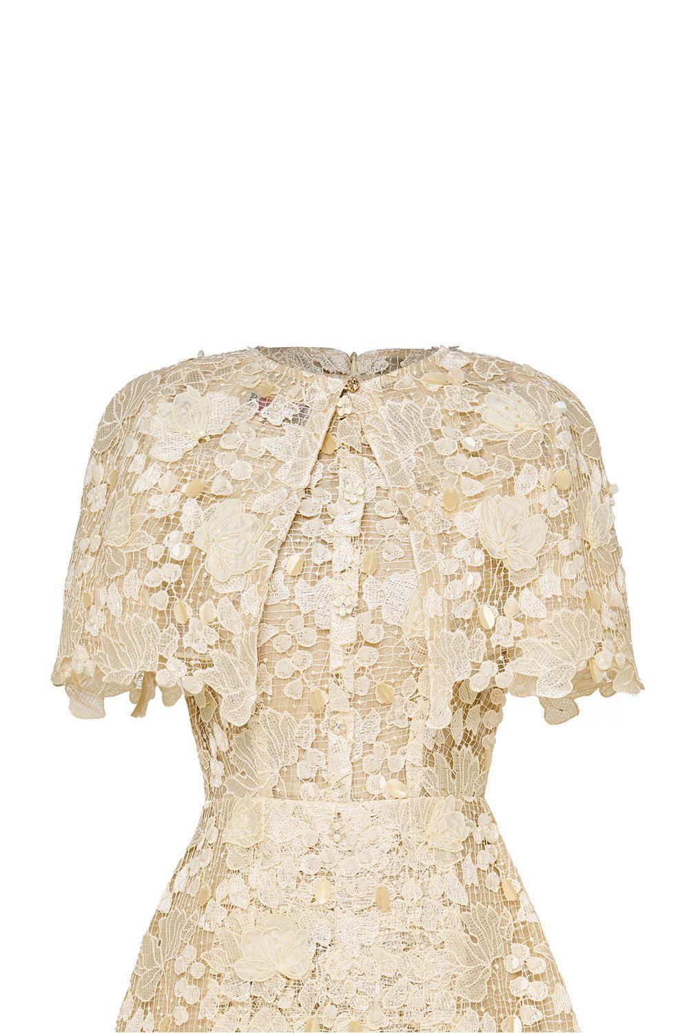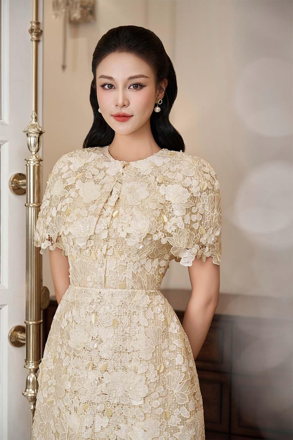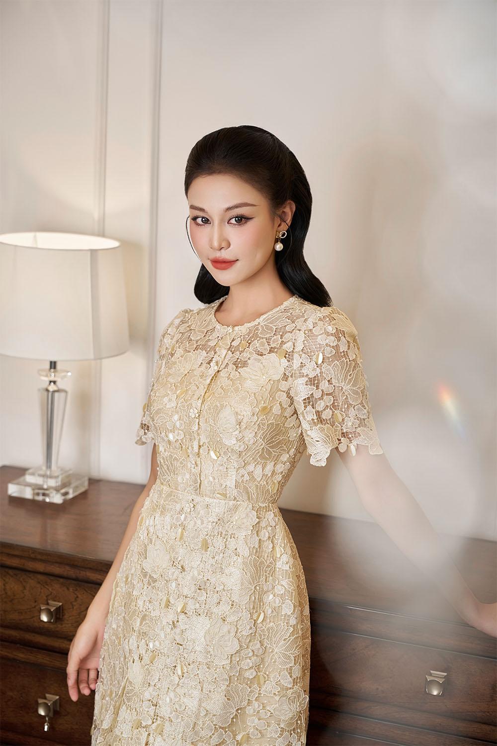This dress features an A-line silhouette and a classic round neck neckline. The elegant lace detailing adds a touch of femininity to this versatile midi dress. Perfect for any occasion, this dress effortlessly flatters any body shape.