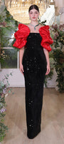 Special Features: Two-color contrast, Big bubble taffeta sleeves with stone, Sequins embossed all over bodice