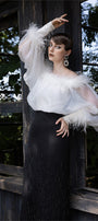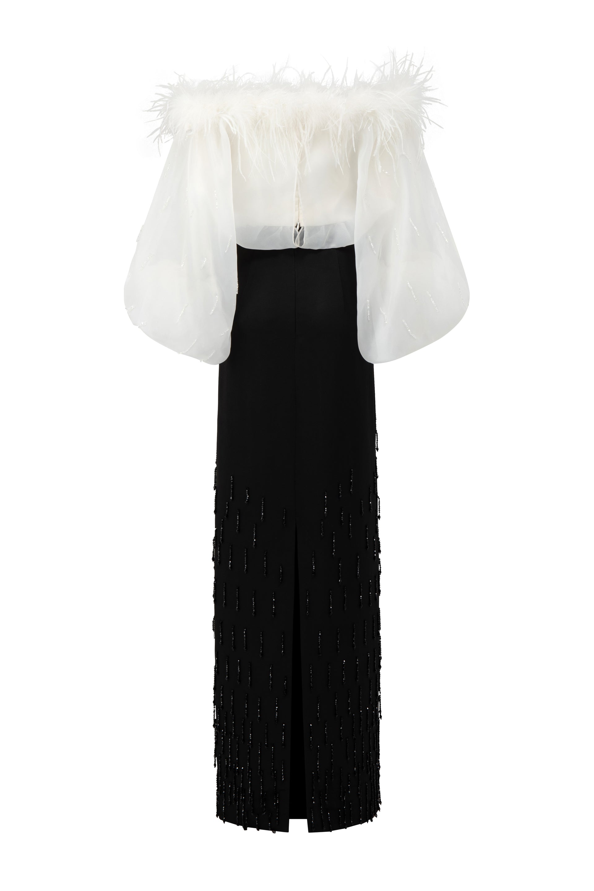 Step into sophistication with this sheath maxi dress, crafted in luxurious organza. Featuring an elegant off-shoulder neckline, dramatic bishop sleeves, and exquisite feather and bead embellishments, it defines contemporary glamour. Perfect for gala dinners, weddings, or upscale evening events.