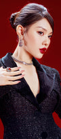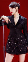 Attached rhinestone and ostrich feather on skirt, Deep V-neck with velvet peak lapel , Single-breasted with matching color button, Glitter tweed