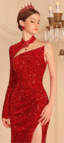 Experience the ultimate in glamour with our dress. The asymmetric side slit adds a unique and stylish touch to this dress, perfect for making a statement at any event. Sparkle and shine with confidence in this stunning dress.