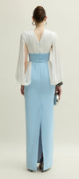 Elevate your wardrobe with this cotton sheath maxi dress, featuring a sophisticated V-neck and elegant split sleeves. Meticulous gathering detail adds refinement. Perfect for weddings, evening parties, or any upscale occasion requiring timeless style.