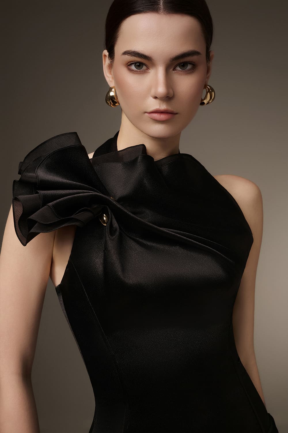 Special Features: Twist tremendous floral on the side of shoulder, Metal pin, Draped fitted waist and skirt, Corset waist, Upper silk, lower spandex