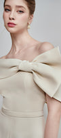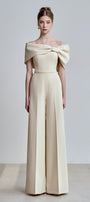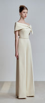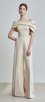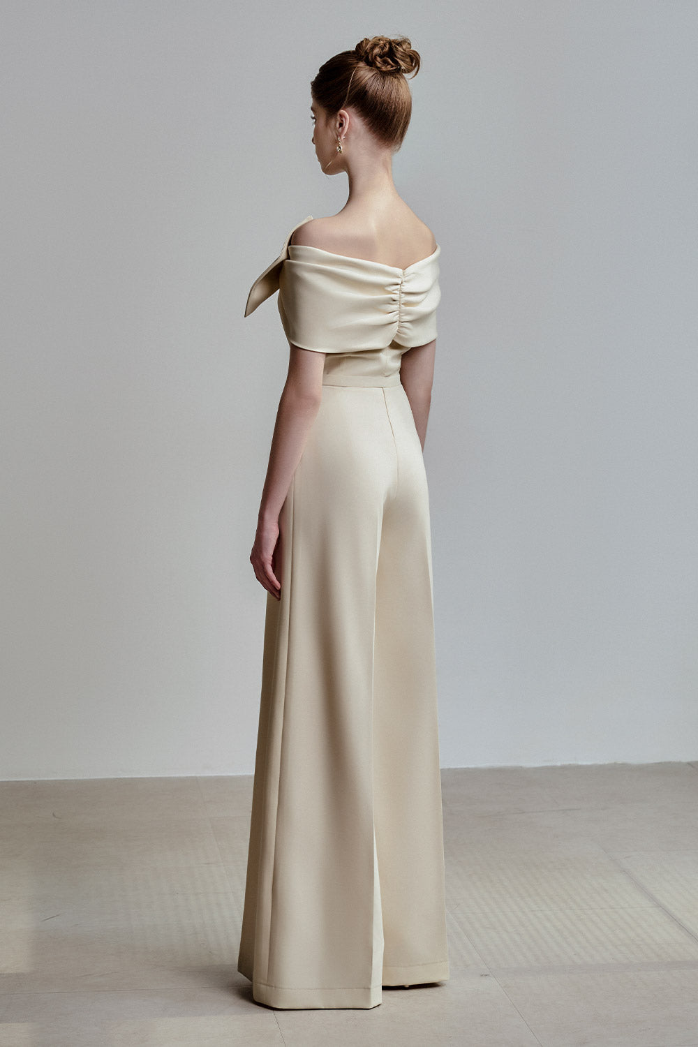 Asymmetric bow shape creates sleeves, Wide leg pants