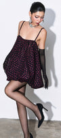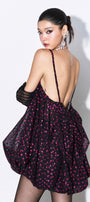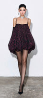 This mini dress features delicate spaghetti straps and a distinctive bubble hem that adds playful volume to the silhouette. The mesh bodice is adorned with subtle glitter detailing, offering a refined shimmer that enhances its elegant yet modern appeal. Perfect for evening events, this dress combines sophisticated design with eye-catching texture for a standout look.
