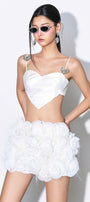 This top features a flattering heart-shaped neckline and delicate spaghetti straps, offering a chic and feminine silhouette. Crafted from shimmering taffeta, it adds a subtle sparkle to your look while the cropped cut enhances your natural waistline for a modern, stylish appeal. Perfect for layering or wearing solo, this top combines elegance with contemporary design.