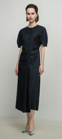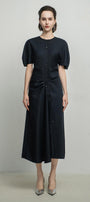 Draped in the middle, Waist dart, Asymmetric button lines, Center back seam