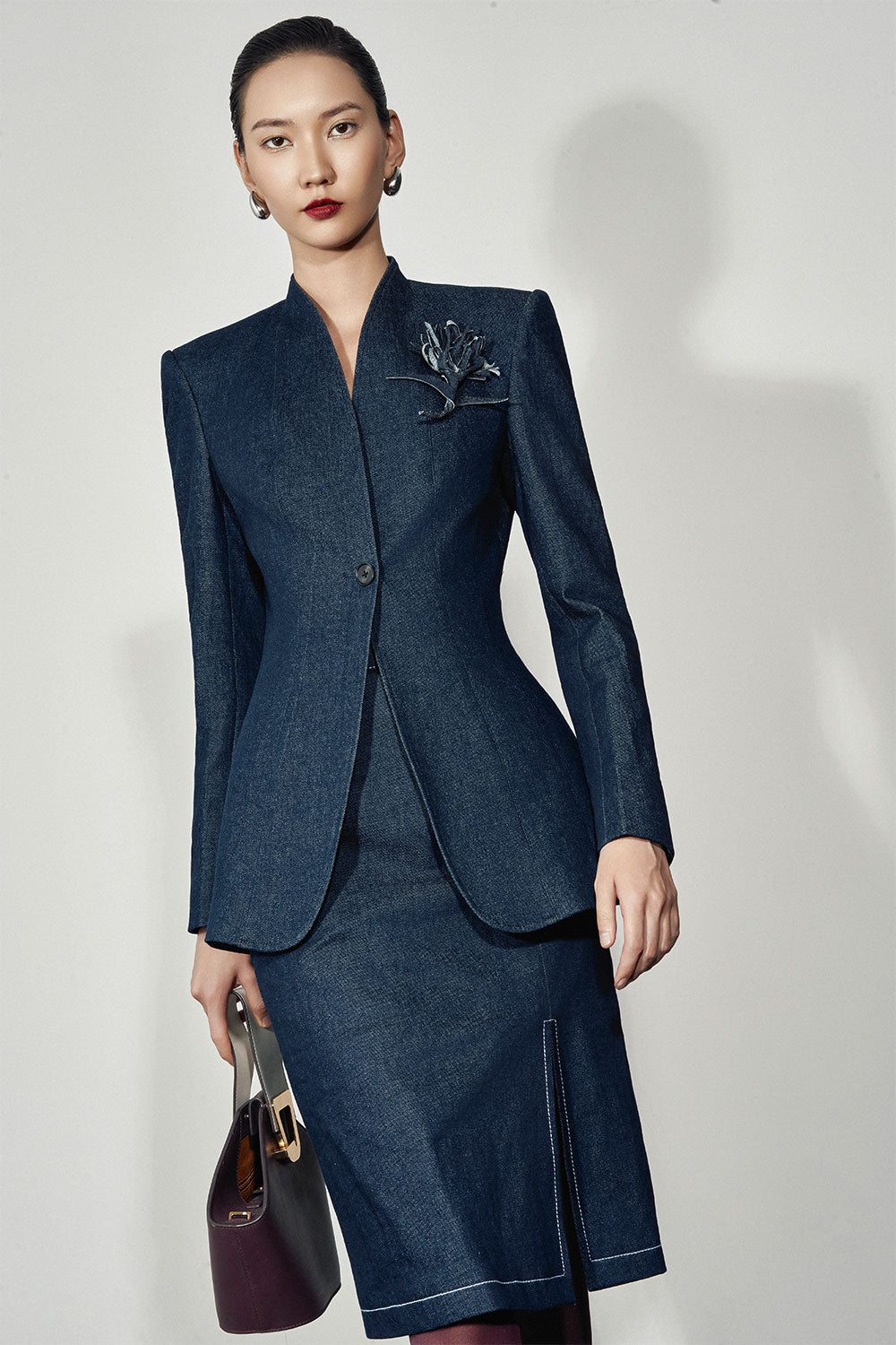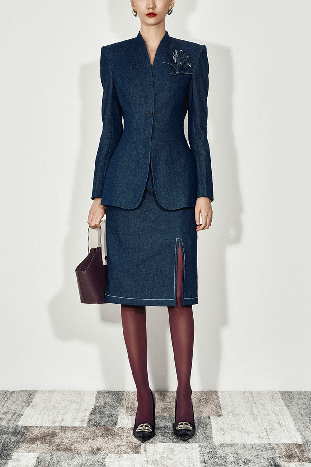 Designed with a flattering A-line silhouette and square shoulders, this blazer adds a modern touch to any outfit. Made from high-quality denim, it offers both style and comfort. Perfect for any business or casual occasion.