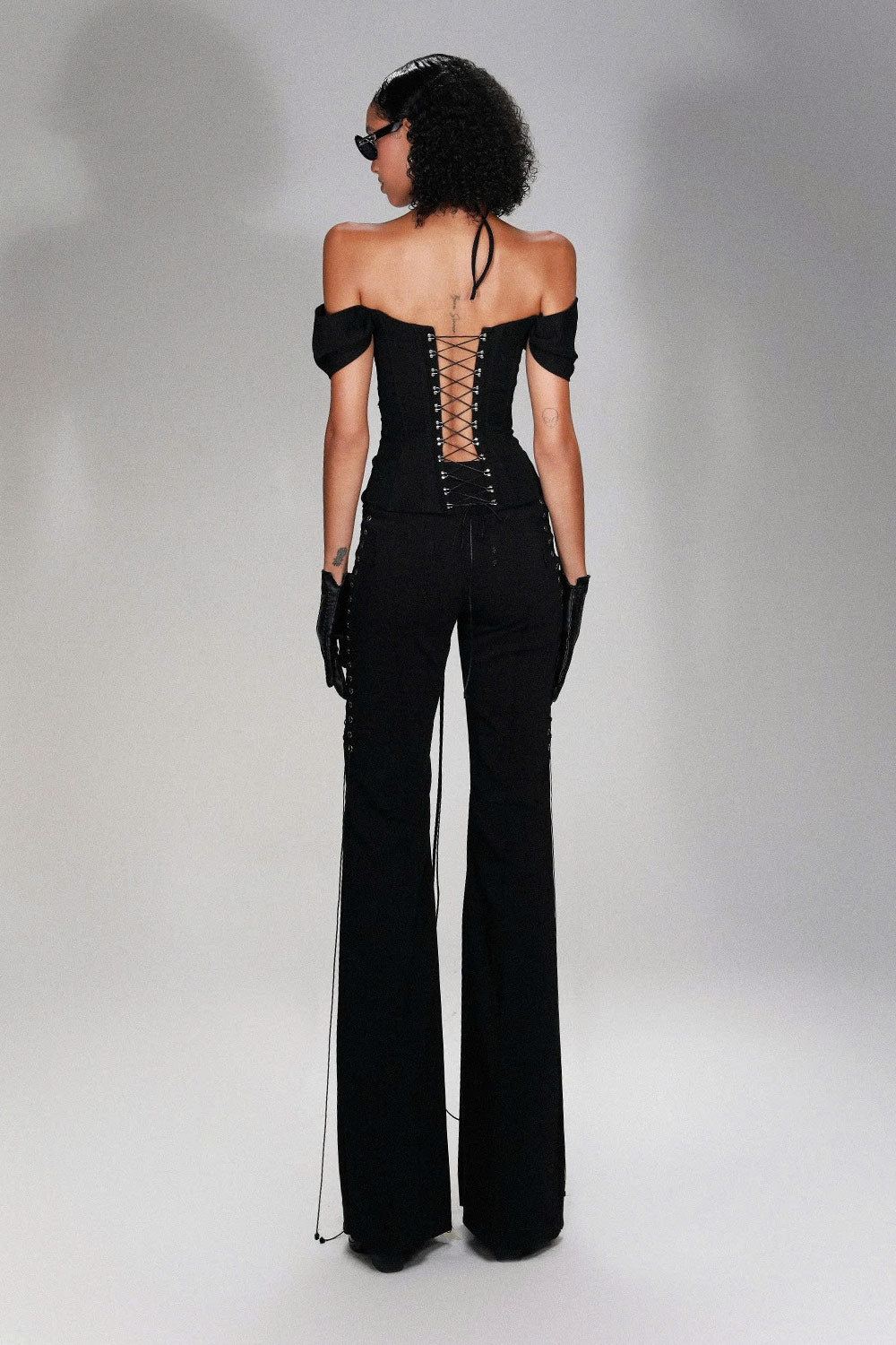 Special Features Crossover tie with long string on the side, Front fly zipper, Ribbed lines on the front