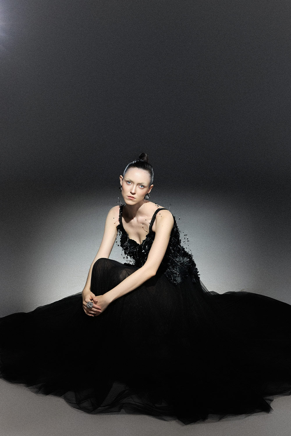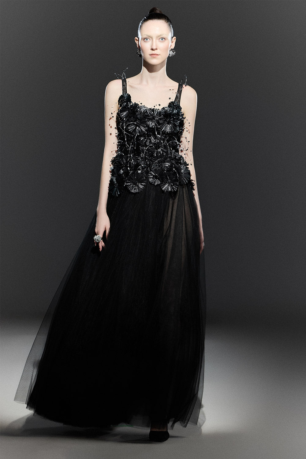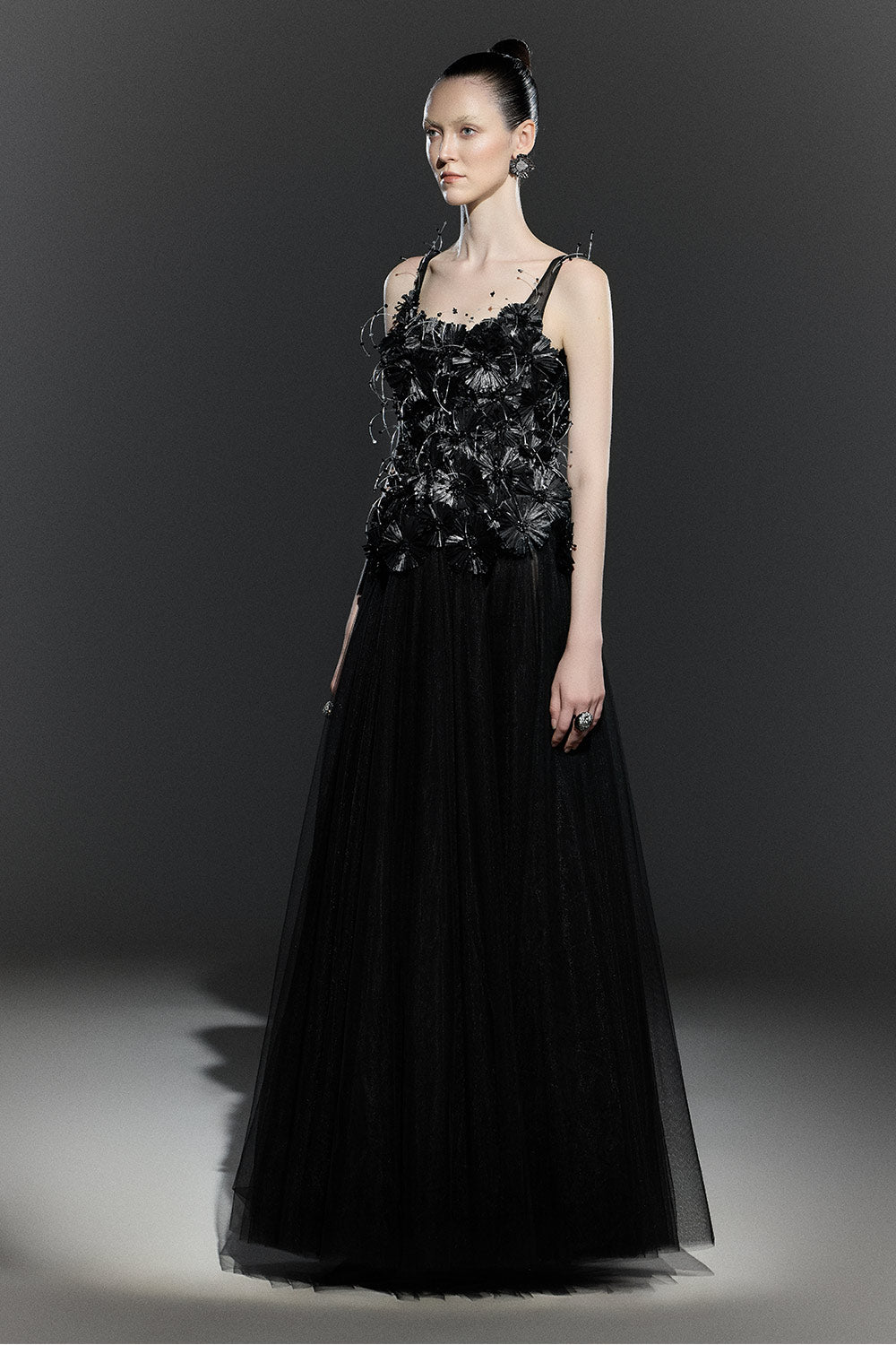Black Bloom A-line Flower Applique Tulle Maxi Dress