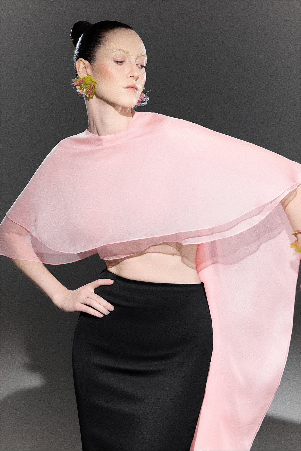 Elevate your style with our top. The unique trapezoid cape sleeves add a touch of elegance to this modern crop top. Its flowy chiffon material provides both comfort and a flattering fit. Perfect for any occasion, this top will make you stand out in any crowd.